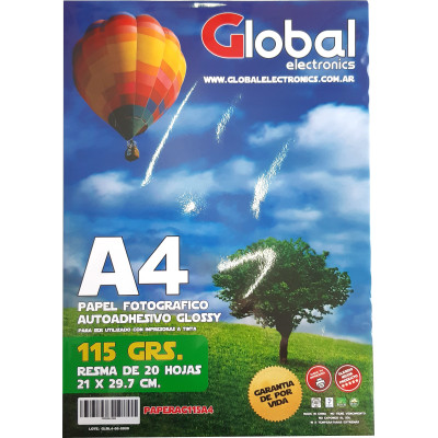 Papel Autoadhesivo Base Agua Glossy en resma de 20 hojas A4 (210 x 297 mm.) de 115 Grs. - Global Electronics