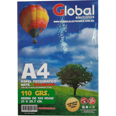 Papel Mate en resma de 100 hojas A4 >> APTO SUBLIMACION << (210 x 297 mm.) de 110 Grs. - Global Electronics